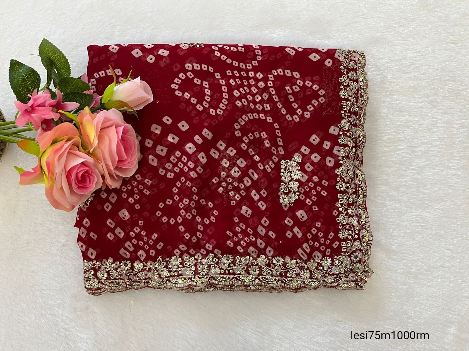 Details Β :- Heavy Georgette Fabric BANDHANI Print saree with beautiful heavy Sequence C- Pallu work in all over saree